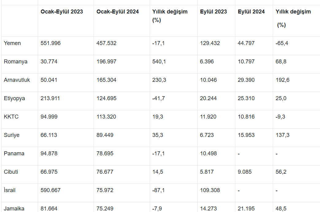 Aynı dönemde, Türkiye'nin en fazla inşaat demiri ihraç ettiği ülke, yıllık yüzde 17,1 düşüşle 551.996 mt inşaat demiri ihracatı yapılan Yemen oldu. Yemen’i Türkiye'den 196.997 mt inşaat demiri satın alan Romanya ve