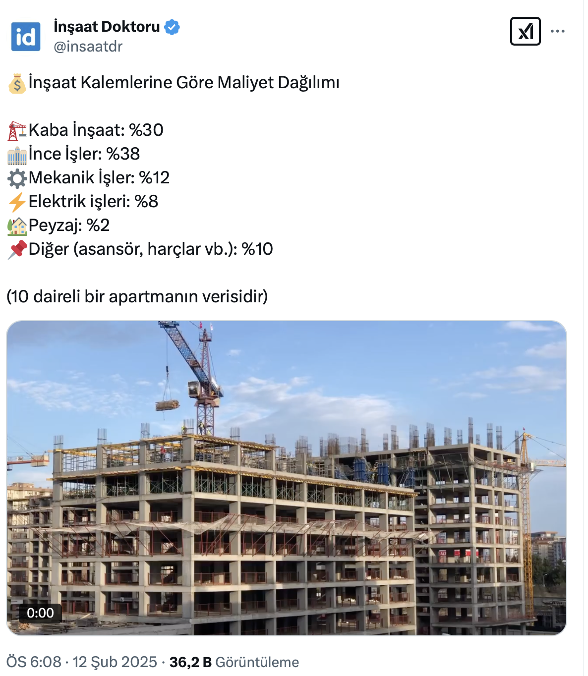 28 bin takipçili İnşaat Doktoru resmi X hesabı https://twitter.com/insaatdr üzerinden inşaat kalemlerine göre maliyet dağılımını paylaştı.