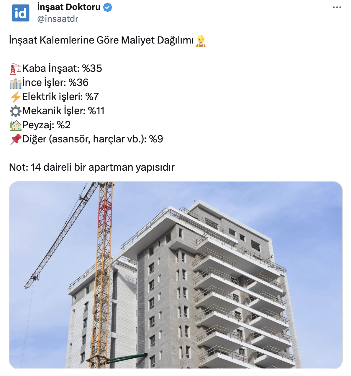 İnşaat Doktoru resmi X hesabı https://twitter.com/insaatdr üzerinden yaptığı paylaşımda inşaat kalemlerine göre maliyet dağılımını açıkladı.