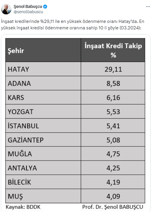 Ekonomist Şenol Babuşcu sosyal medya hesabından en yüksek inşaat kredisi ödenmeme oranına sahip 10 ili açıkladı. Buna göre; En yüksek ödenmeme oranı Hatay oldu. İşte Babuşçu'nun o paylaşımı ve gelen yorumlar...