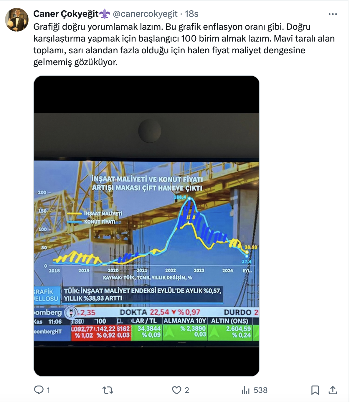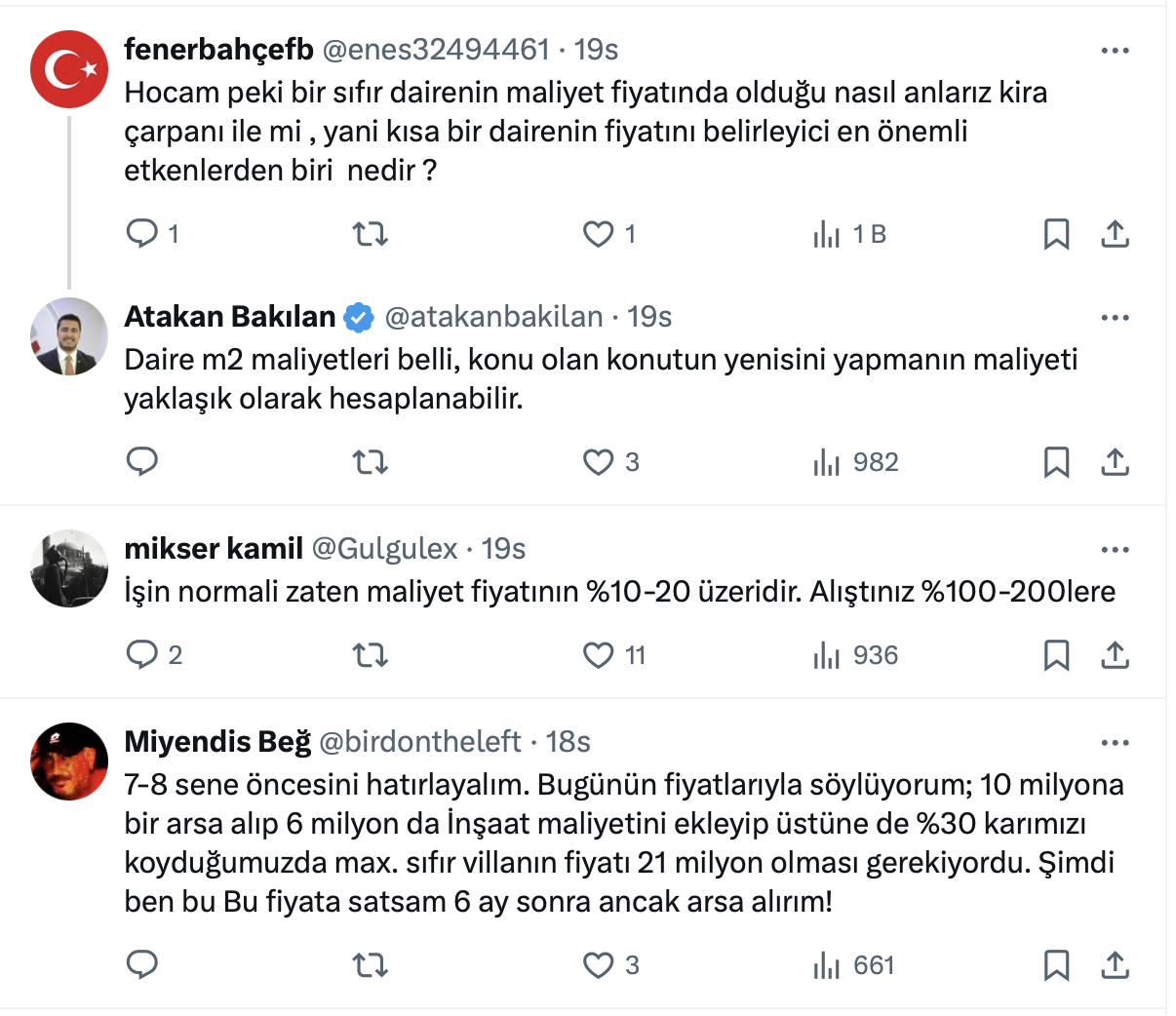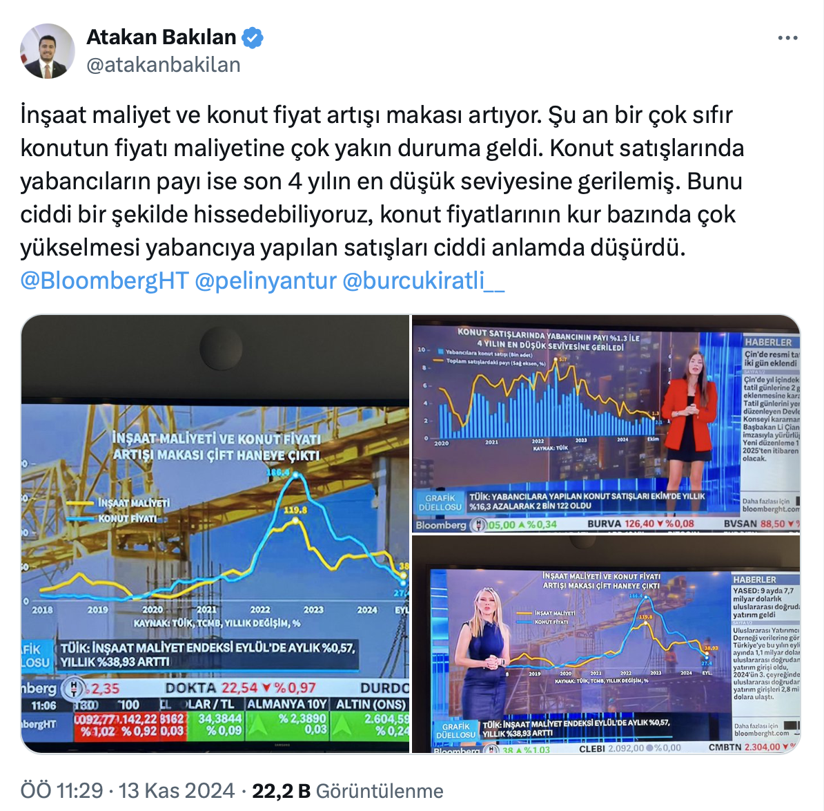 İnşaat Mühendisi Atakan Bakılan yaptığı paylaşımda inşaat maliyet ve konut fiyat artışı makasının arttığını söyleyerek, şu an bir çok sıfır konutun fiyatının maliyetine çok yakın duruma geldiğini belirtti.