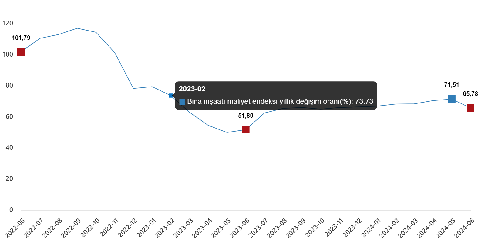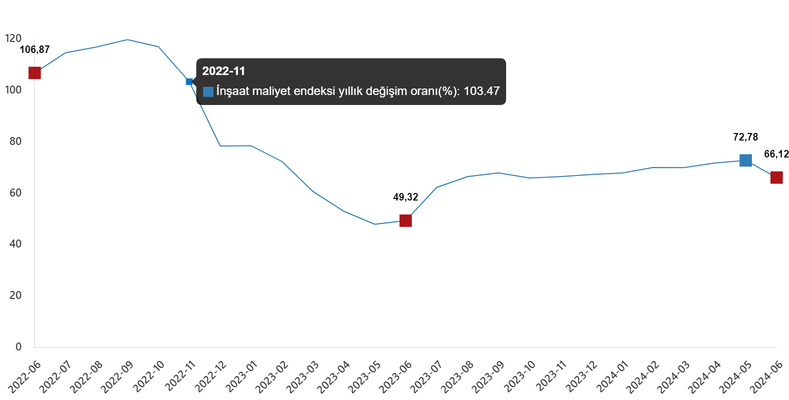 Türkiye İstatistik Kurumu tarafından açıklanan rakamlara göre inşaat maliyet endeksi, 2024 yılı Mayıs ayında bir önceki aya göre yüzde 1,11 artış gösterirken, bir önceki senenin aynı ayına göre yüzde 72,78 artmıştı. Ayrıca bir önceki senenin aynı ayına göre malzeme endeksi yüzde 58,75 artış gösterirken, işçilik endeksi yüzde 108,93 arttı.