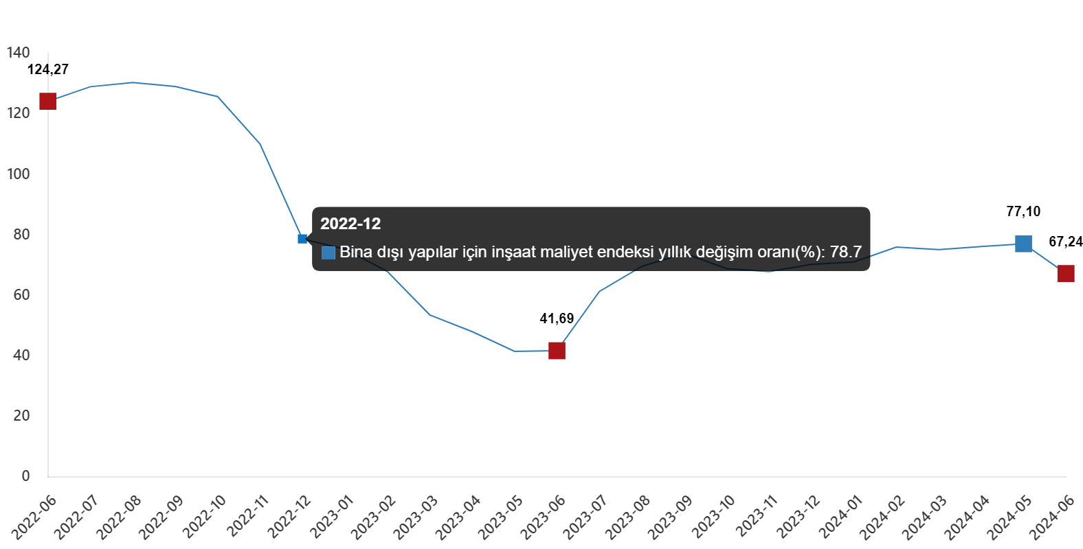 Bina dışı yapılar için inşaat maliyet endeksi, bir önceki aya göre yüzde 0,52, bir önceki yılın aynı ayına göre yüzde 67,24 arttı.