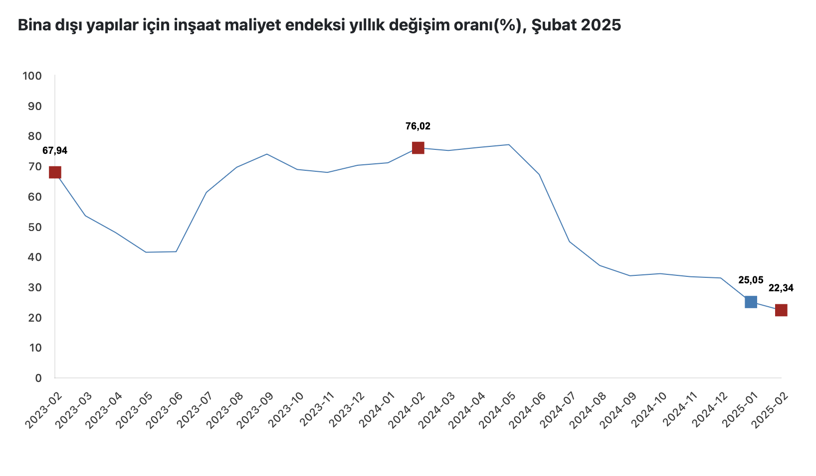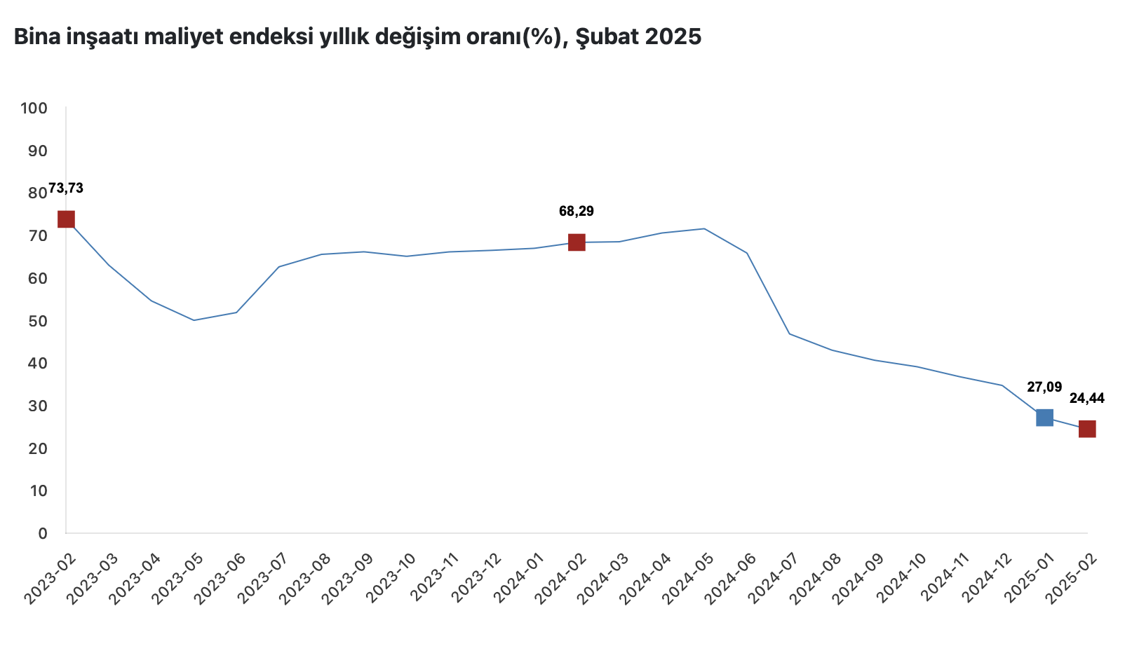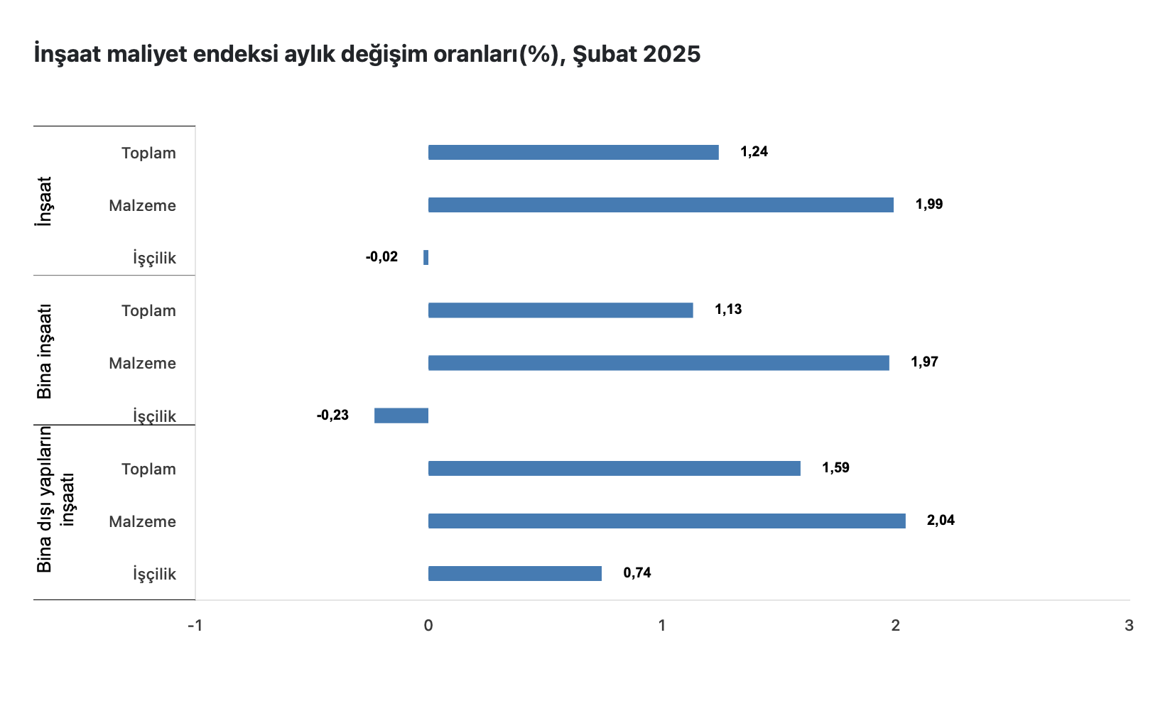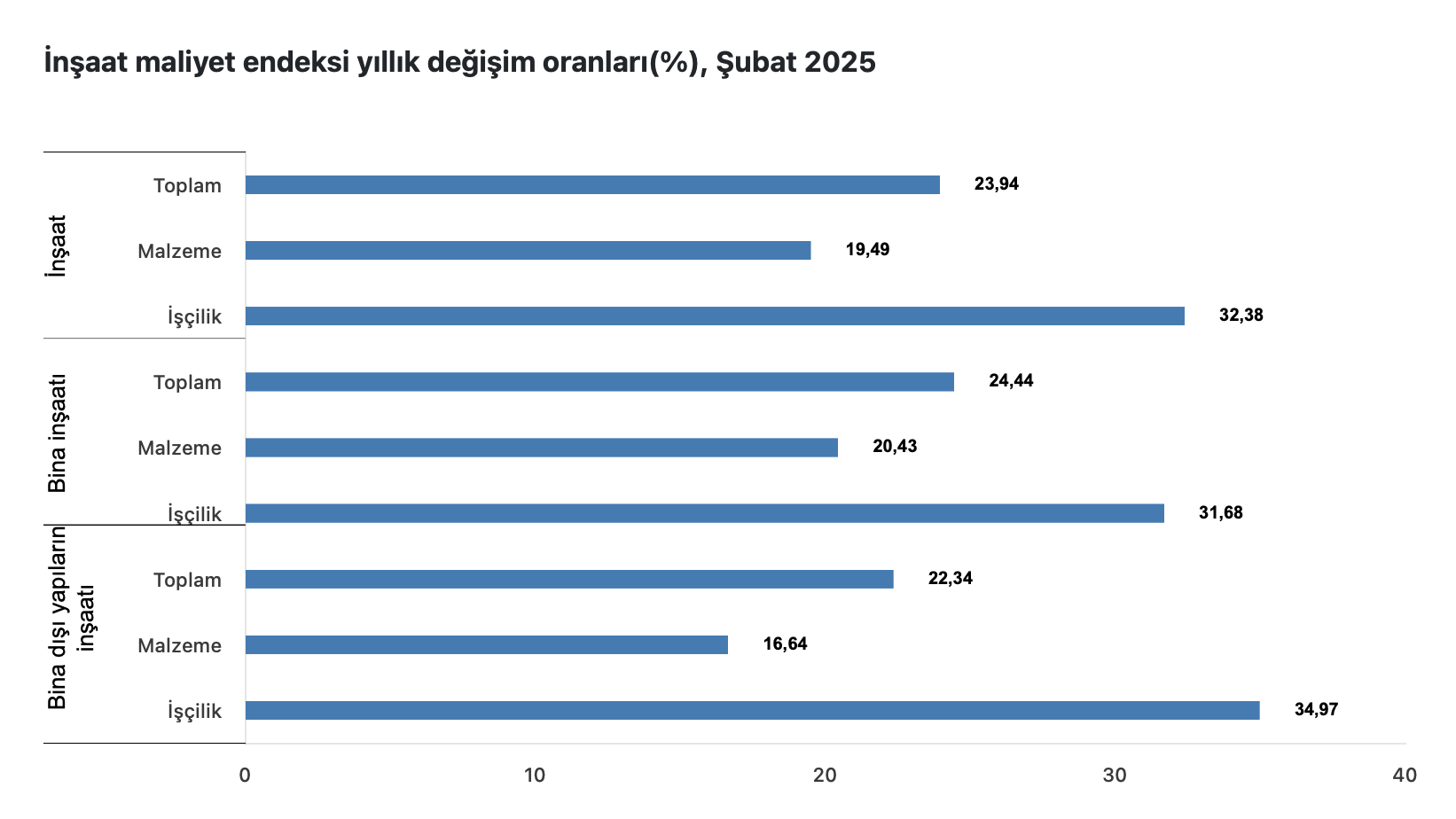 Türkiye İstatistik Kurumu tarafından açıklanan rakamlara göre İnşaat maliyet endeksi, 2025 yılı Şubat ayında bir önceki aya göre yüzde 1,24 artarken, bir önceki senenin aynı ayına göre yüzde 23,94 artış gösterdi.