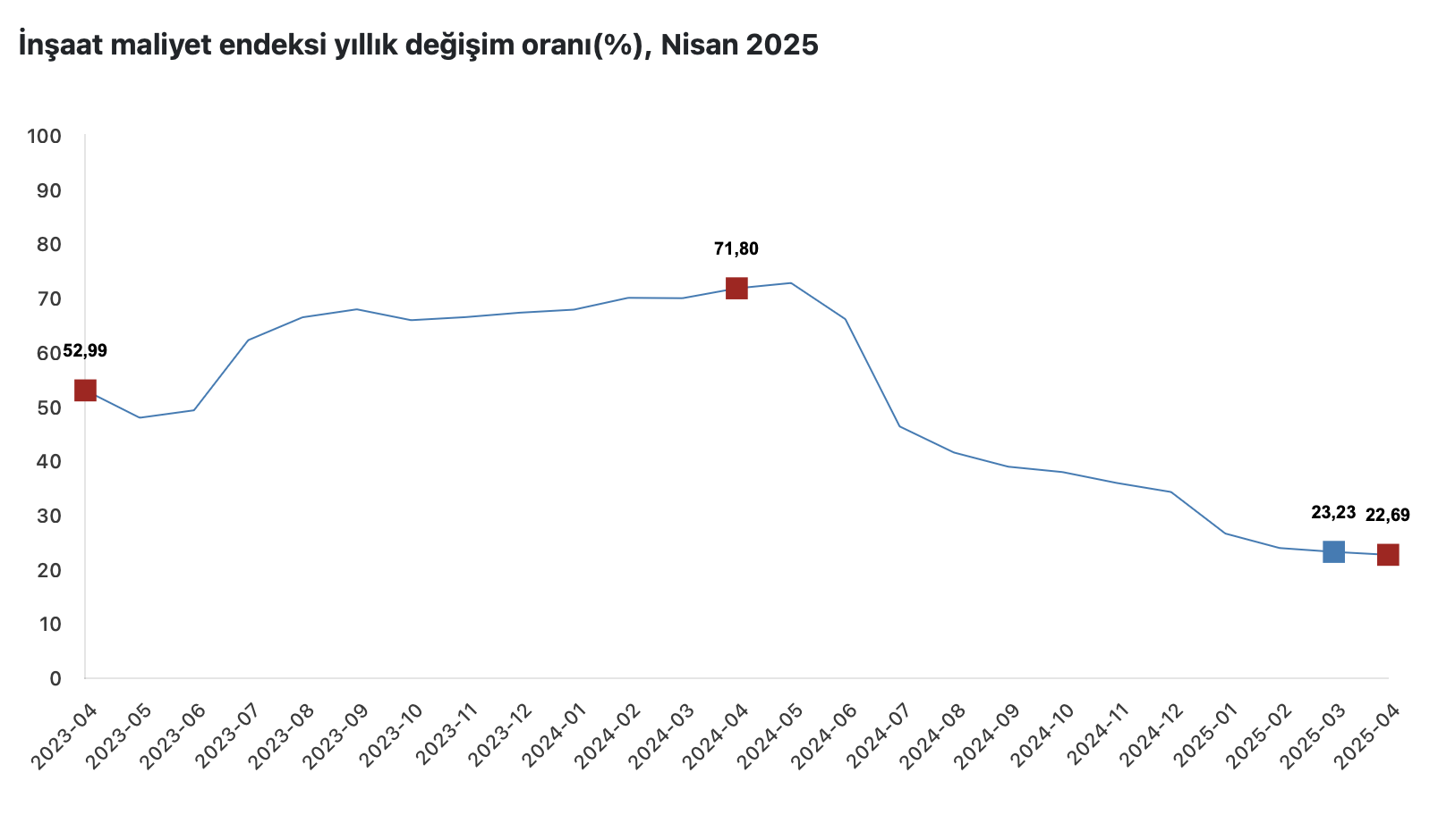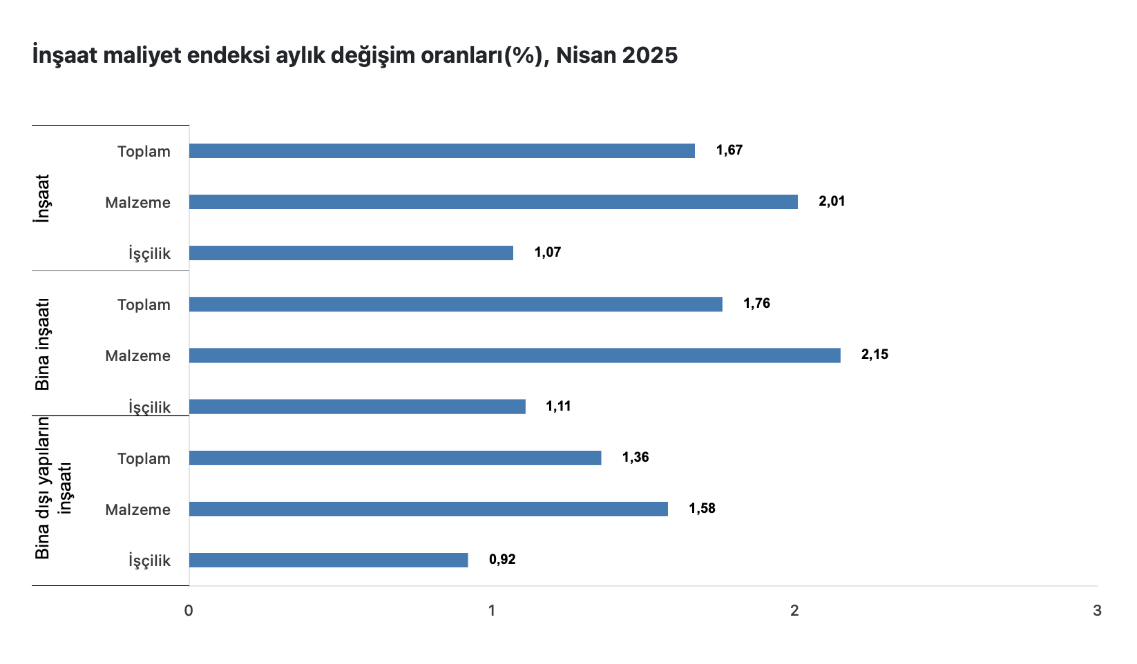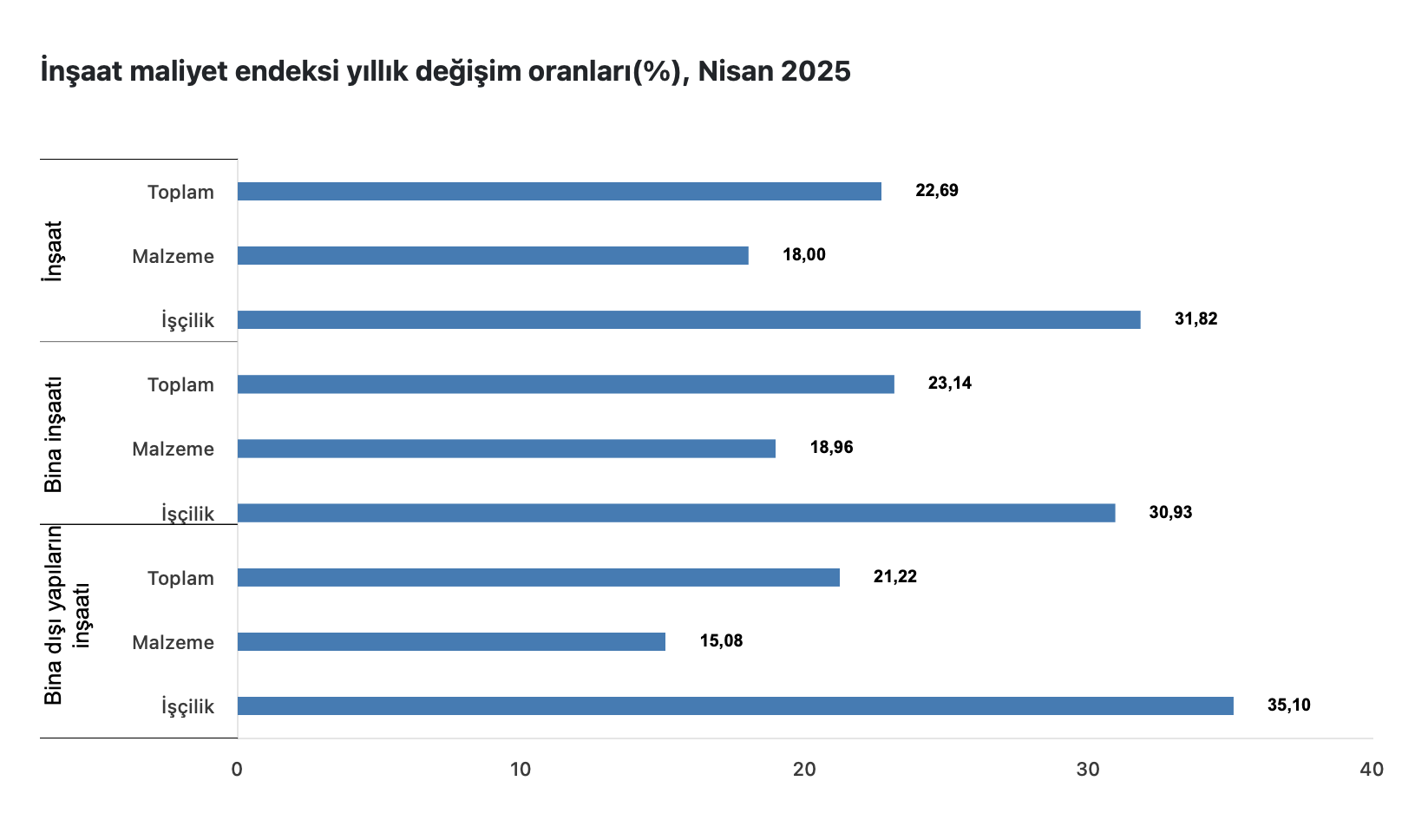 Türkiye İstatistik Kurumu tarafından açıklanan rakamlara göre inşaat maliyet endeksi, 2025 yılı Nisan ayında bir önceki aya göre yüzde 1,67 arttı, bir önceki yılın aynı ayına göre yüzde 22,69 arttı.
