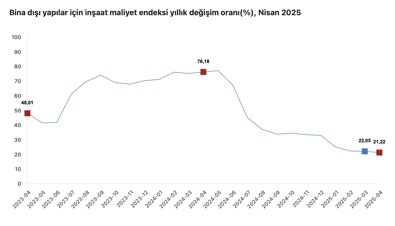 Türkiye İstatistik Kurumu’nun açıkladığı inşaat maliyet endeksine göre bina dışı yapılar için inşaat maliyet endeksi, bir önceki aya göre yüzde 1,36 artarken, bir önceki senenin aynı ayına göre yüzde 21,22 artış gösterdi. Bir önceki aya göre malzeme endeksi yüzde 1,58 artarken, işçilik endeksi yüzde 0,92 artış gösterdi.