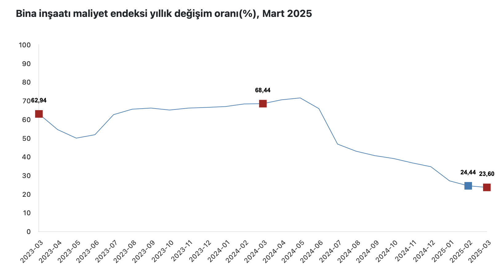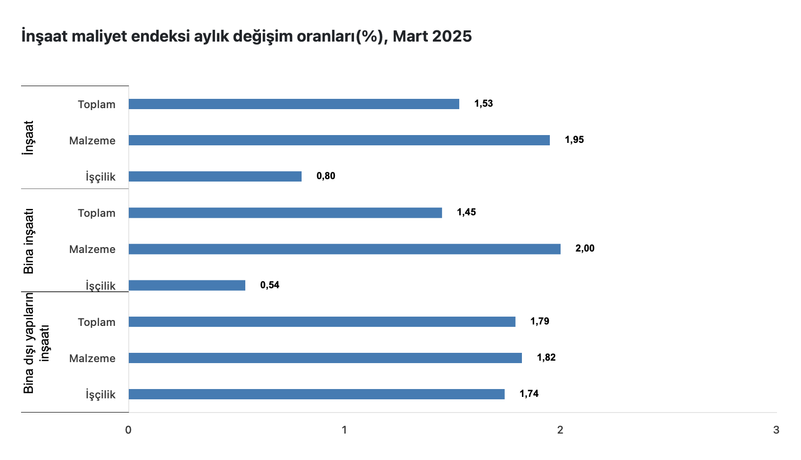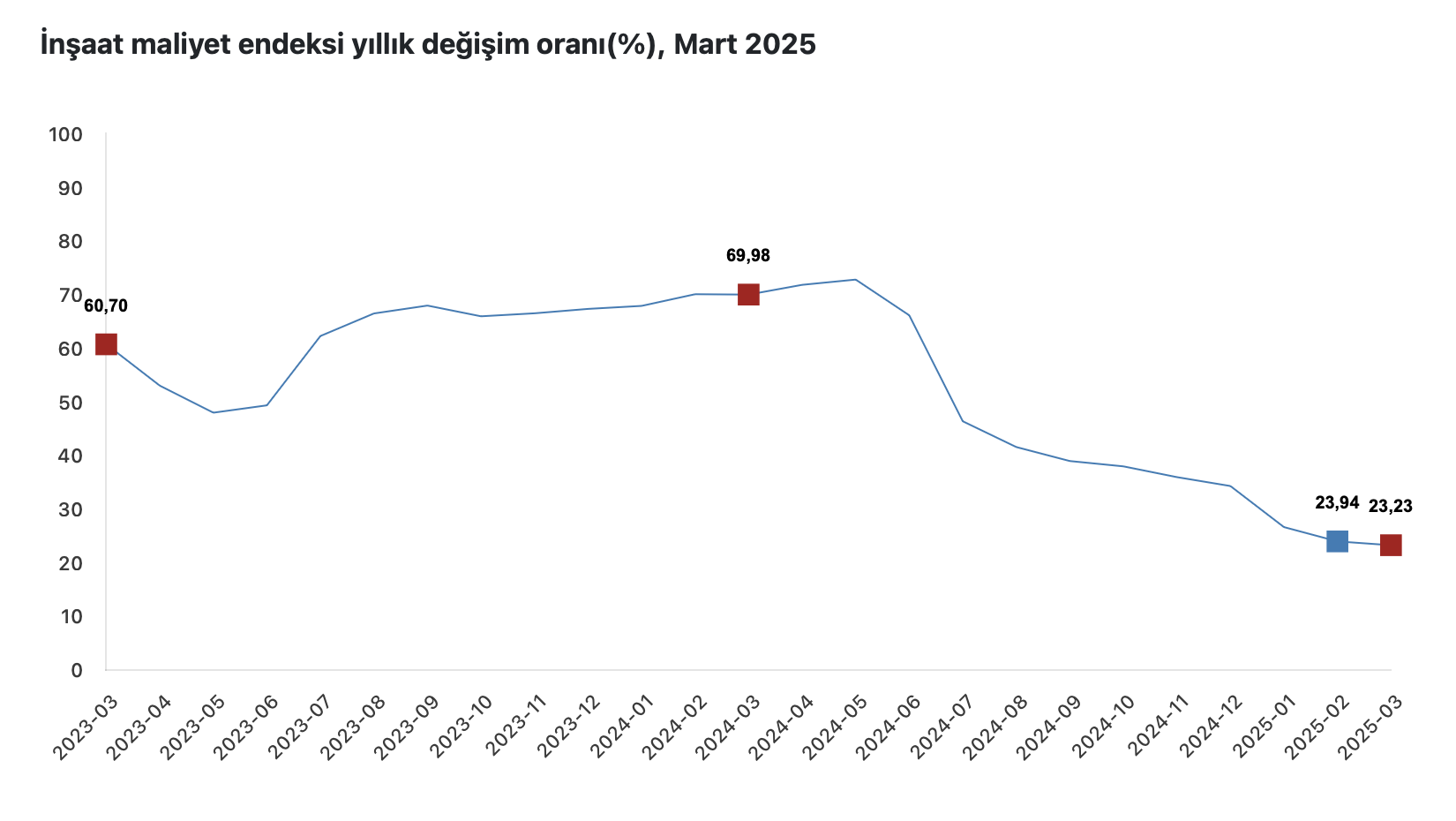 Türkiye İstatistik Kurumu tarafından açıklanan rakamlara göre gündemden düşmeyen İnşaat maliyet endeksi, 2025 yılı Mart ayında bir önceki aya göre yüzde 1,53 artış gösterirken, bir önceki yılın aynı ayına göre yüzde 23,23 artış gösterdi.