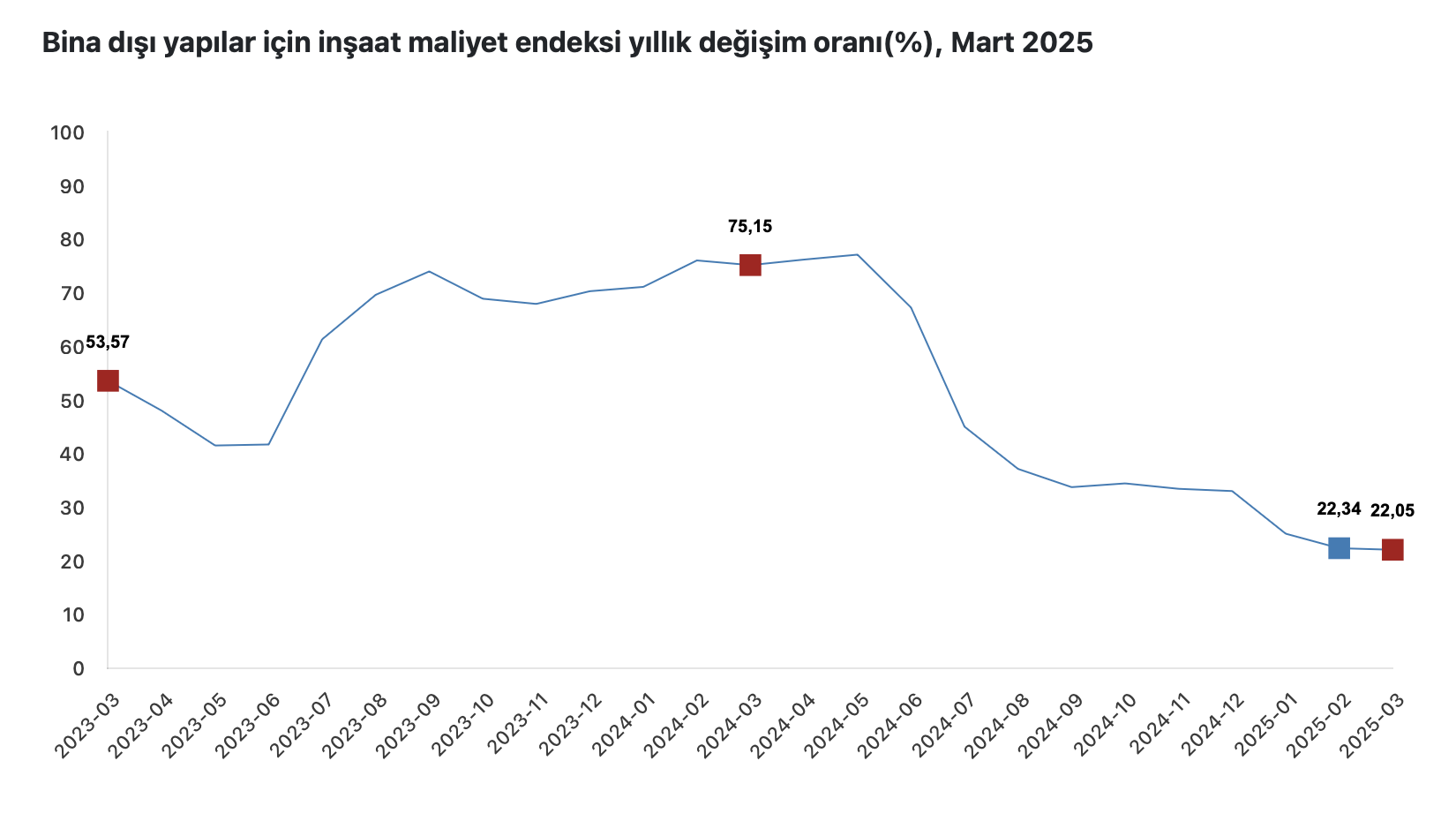 Türkiye İstatistik Kurumu tarafından açıklanan verilere göre bina dışı yapılar için inşaat maliyet endeksi, bir önceki aya göre yüzde 1,79 artarken, bir önceki senenin aynı ayına göre yüzde 22,05 artış gösterdi.