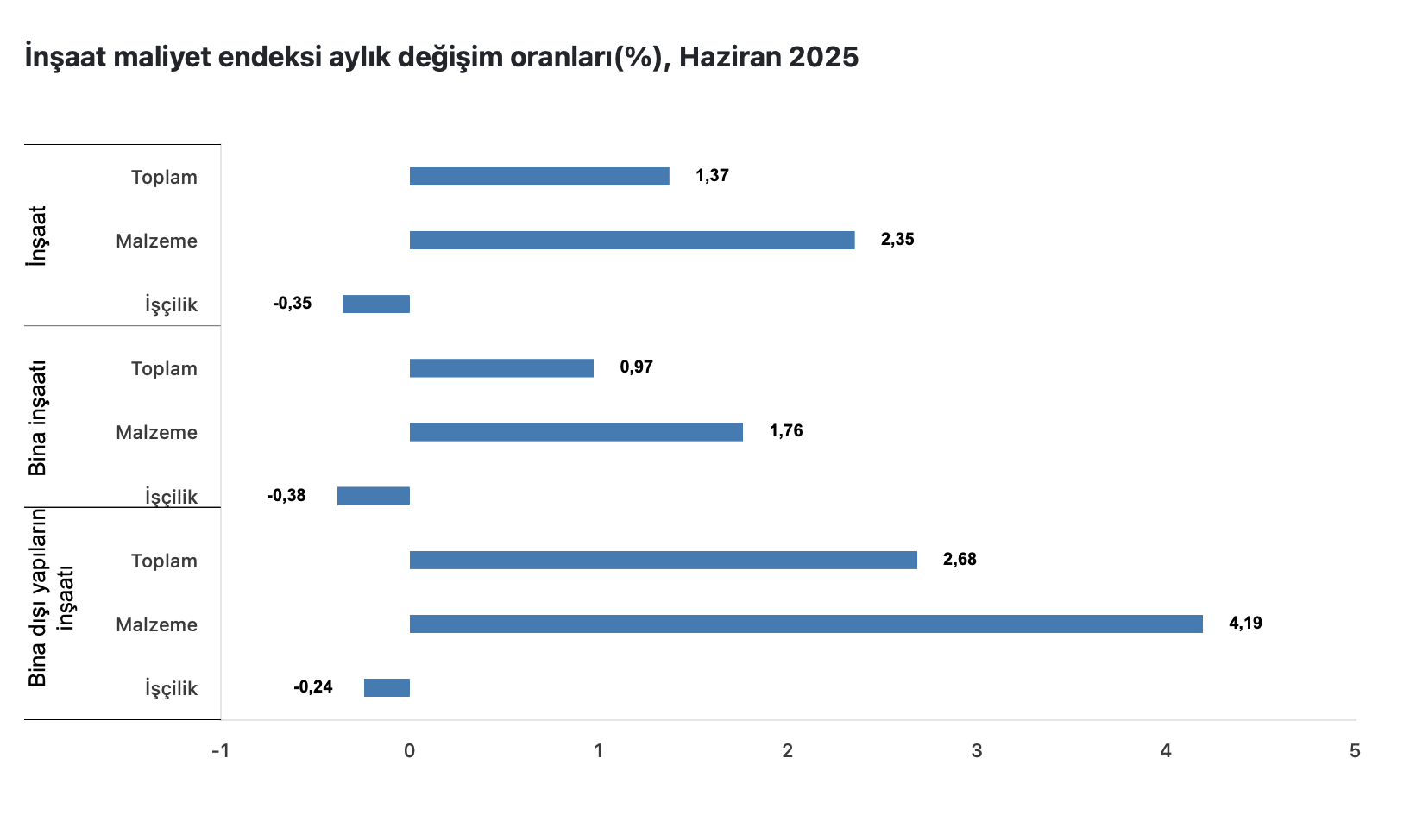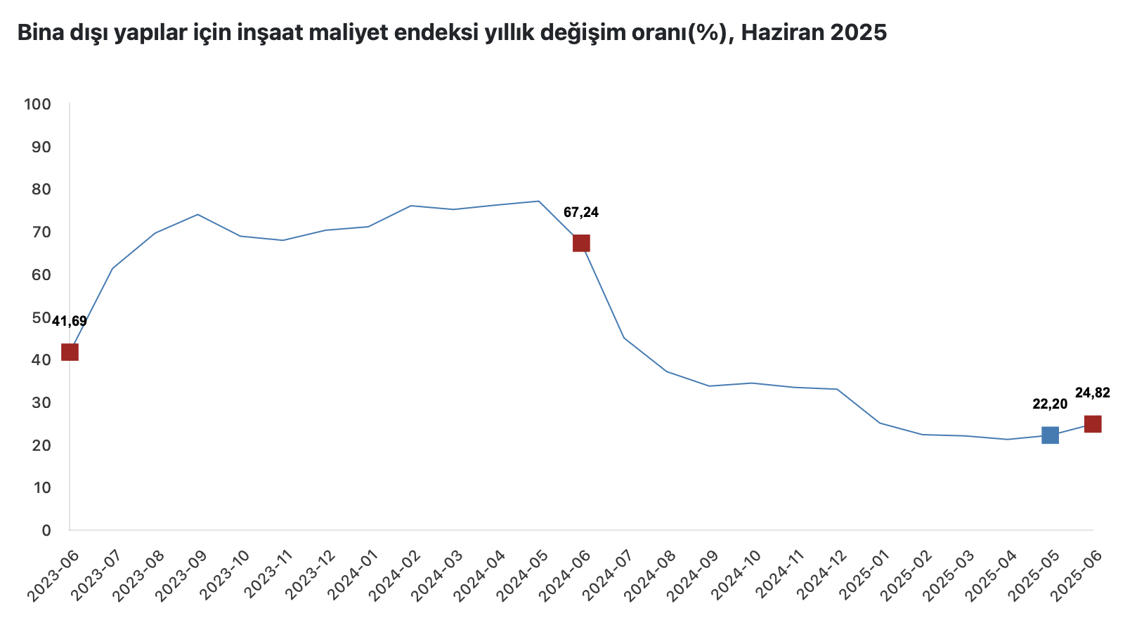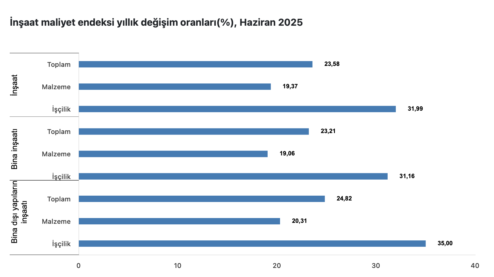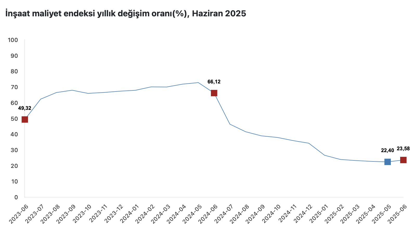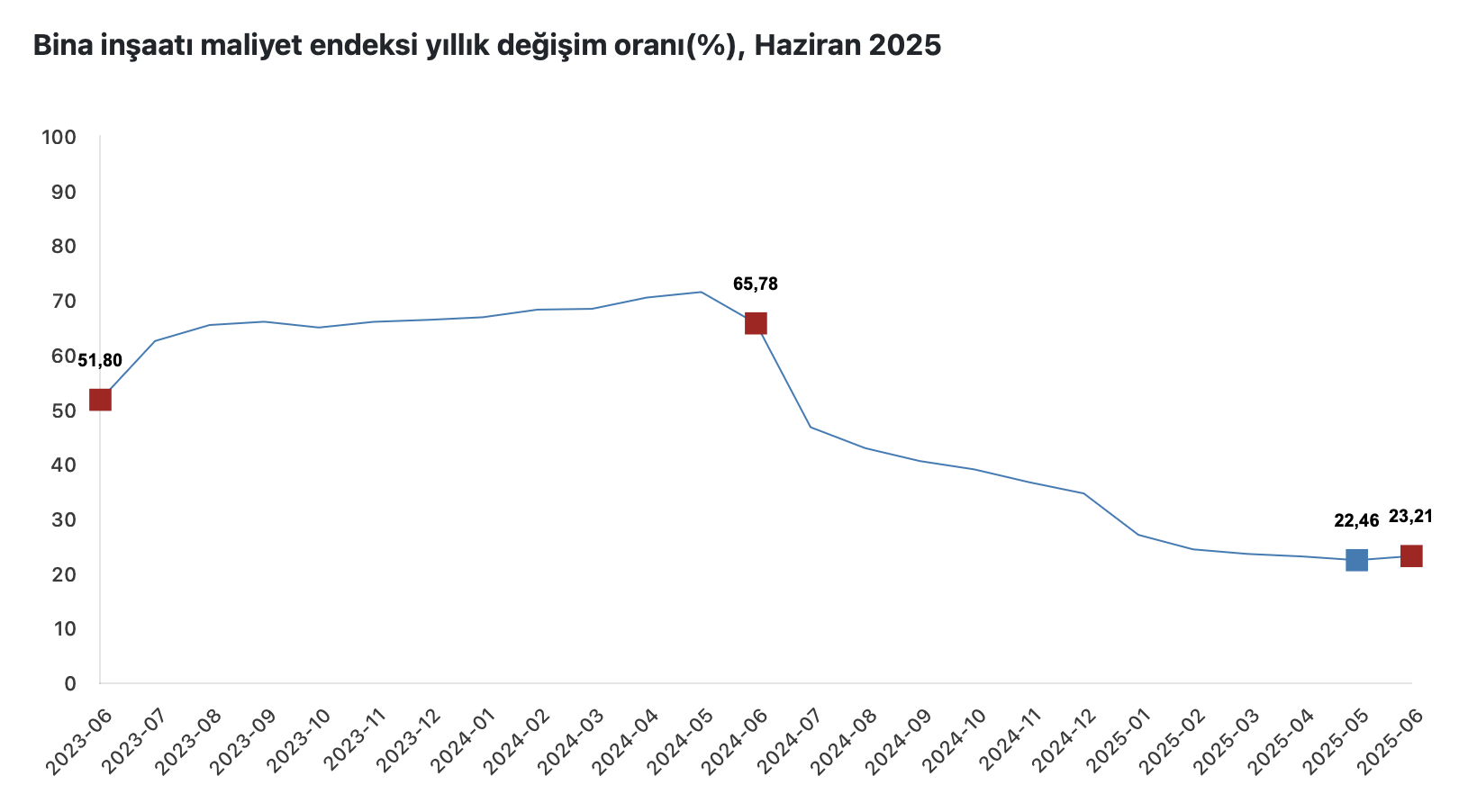 Türkiye İstatistik Kurumu tarafından açıklanan rakamlara göre inşaat maliyet endeksi, 2025 yılı Haziran ayında bir önceki aya göre yüzde 1,37 arttı, bir önceki yılın aynı ayına göre yüzde 23,58 arttı