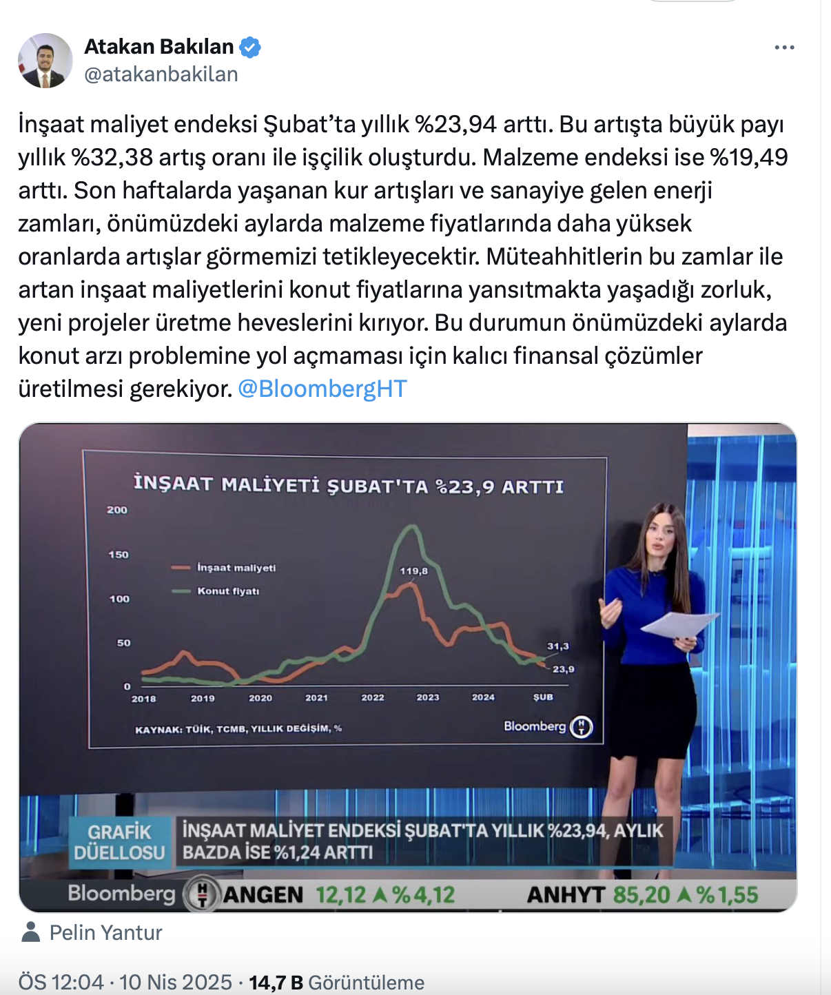Atakan Bakılan resmi X hesabı https://x.com/atakanbakilan üzerinden yaptığı paylaşımda inşaat maliyetlerindeki artışta büyük payı yıllık %32,38 artış oranı ile işçilik oluşturduğunu söyledi.