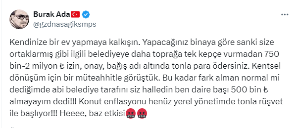 Burak Ada, https://x.com/gzdnasagiksmps X sosyal medya hesabından yaptığı paylaşımda inşaat maliyetlerinin artmasında, belediyelere verilen inşaat izni, onay ve bağış paralarının da büyük etkisi olduğunu kaydetti.