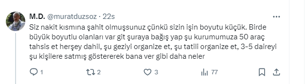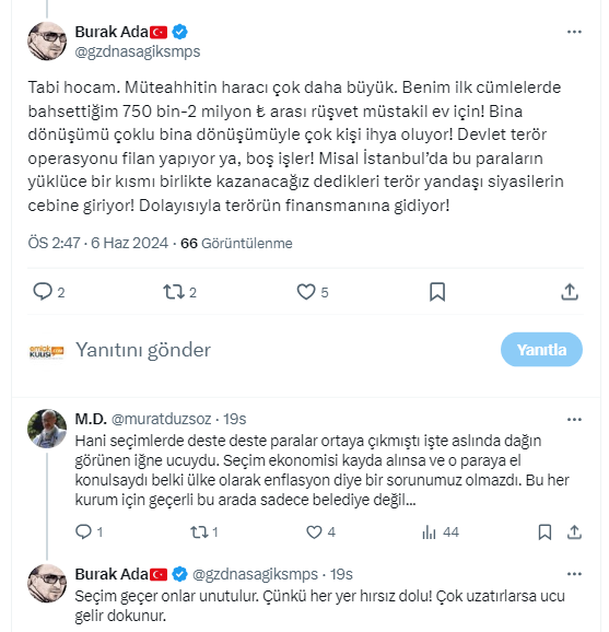 Burak Ada, yaptığı paylaşımda “Kendinize bir ev yapmaya kalkışın. Yapacağınız binaya göre sanki size ortaklarmış gibi ilgili belediyeye daha toprağa tek kepçe vurmadan 750 bin-2 milyon ₺ izin, onay, bağış adı altında tonla para ödersiniz. Kentsel dönüşüm için bir müteahhitle görüştük. Bu kadar fark alman normal mi dediğimde abi belediye tarafını siz halledin ben daire başı 500 bin ₺ almayayım dedi!!! Konut enflasyonu henüz yerel yönetimde tonla rüşvet ile başlıyor!!! Heeee, baz etkisi..” diyerek inşaat sektöründe yaşanan bu duruma dikkat çekti.