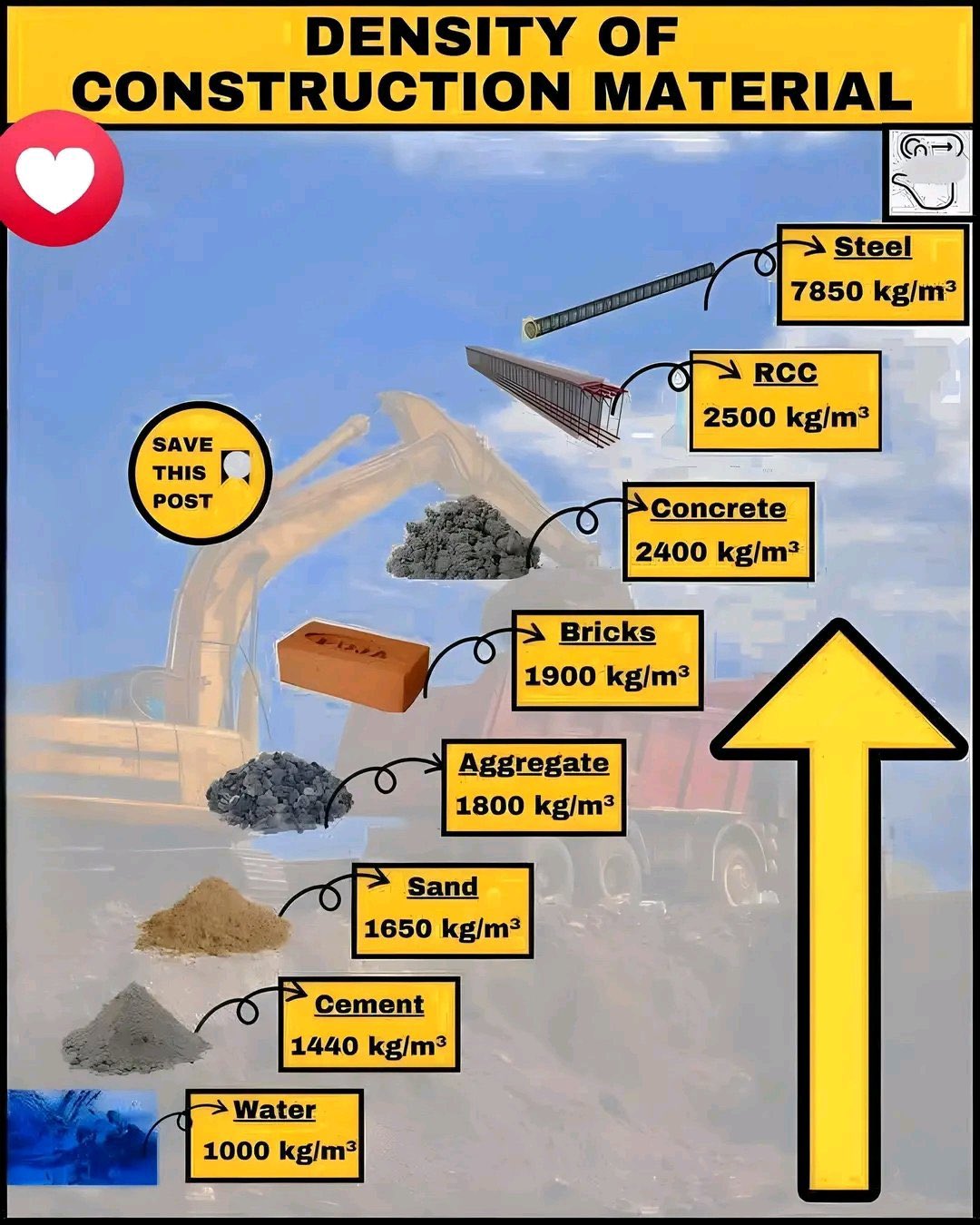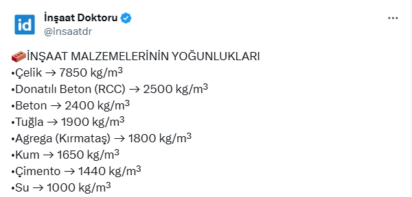 İnşaat Doktoru resmi X hesabı https://twitter.com/insaatdr üzerinden İnşaat malzemelerinin yoğunluklarını paylaştı.