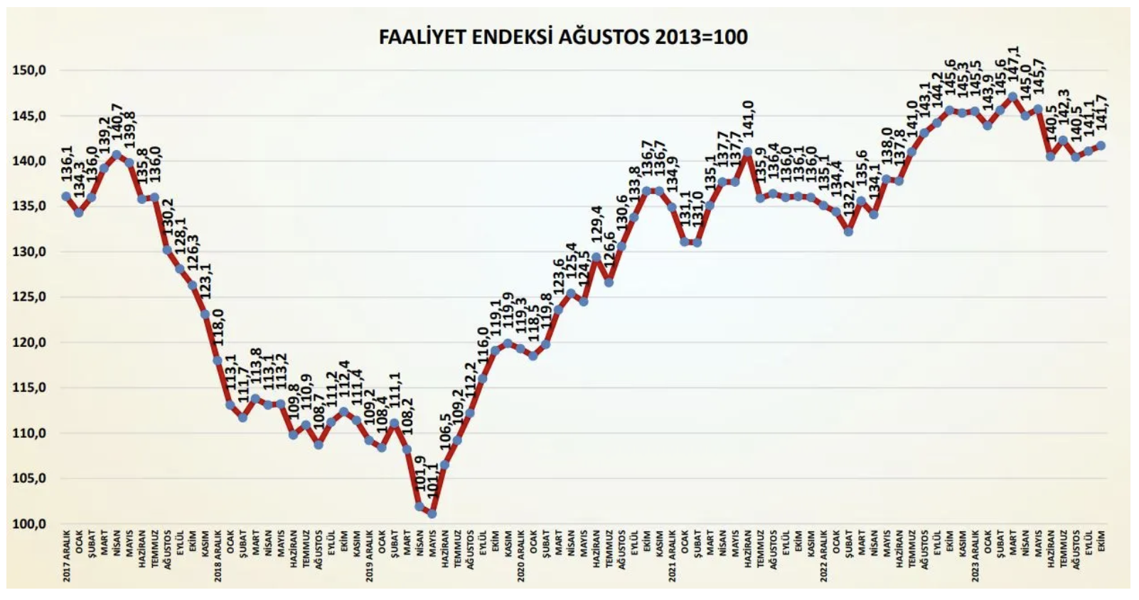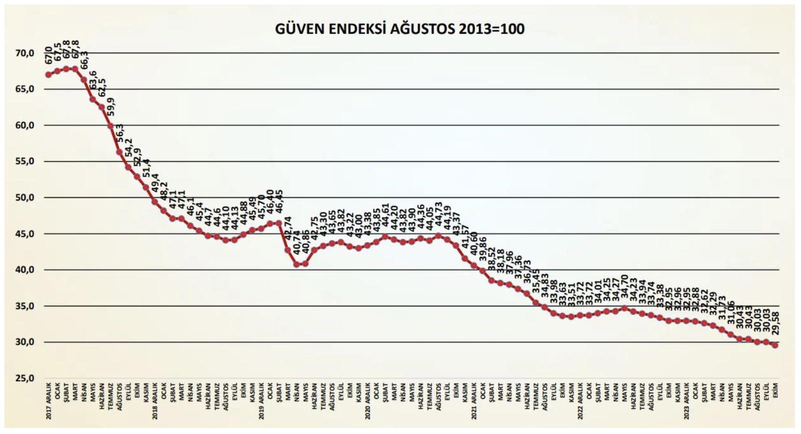 Ekim’de güven endeksi, bir önceki aya göre 0,45 puanlık düşüş göstererek, 29,58 puana inerken. Türkiye ekonomisine ilişkin genel güven seviyesi zayıf kalmayı sürdürürken, yurt içi pazarlara olan güvenin hafif bir artış, ihracat pazarlarına güvenin de düşüş gösterdiği belirtildi. Beklenti endeksi de Ekim’de 0,5 puan azalma göstererek 53,1 puan seviyesine geriledi. Söz konusu raporda önümüzdeki üç aya ilişkin üretim, yatırım ve istihdam beklentilerinin belirgin şekilde düştüğüne değinildi.