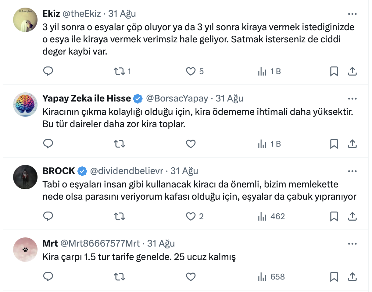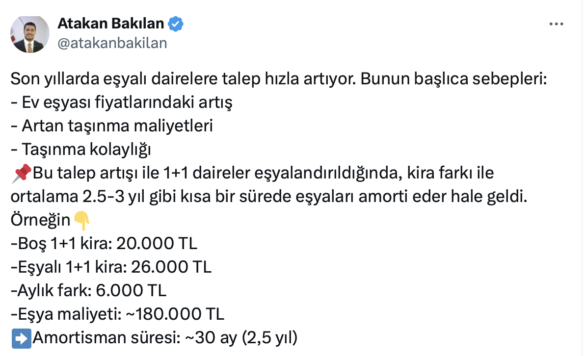 Emlak ve inşaat sektörü ile ilgili olarak yaptığı paylaşımlarla dikkat çeken İnşaat Mühendisi Atakan Bakılan, resmi X hesabı https://x.com/atakanbakilan üzerinden eşyalı dairelere talebin neden arttığını açıkladı. İnşaat Mühendisi