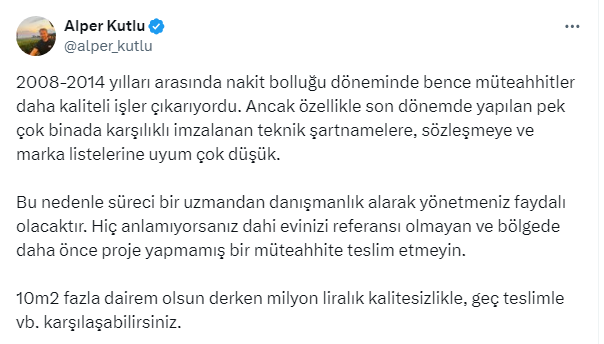 Ev alacakları ve arsasını kat karşılığı verecekleri uyaran İnşaat mühendisi Alper Kutlu, https://x.com/alper_kutlu X sosyal medya hesabından yaptığı paylaşımda şunları söyledi: