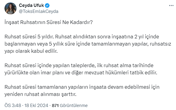 Gayrimenkul uzmanı Ceyda Ufuk sosyal medya hesabından inşaat ruhsatı süresi hakkında bilgi verdi. Ufuk, inşaat ruhsatının süresinin beş yıl olduğunu ve ruhsat alındıktan sonra inşaatına 2 yıl içinde başlanmayan veya 5 yıllık süre içinde tamamlanmayan yapıların, ruhsatsız yapı olarak kabul edildiğini açıkladı.