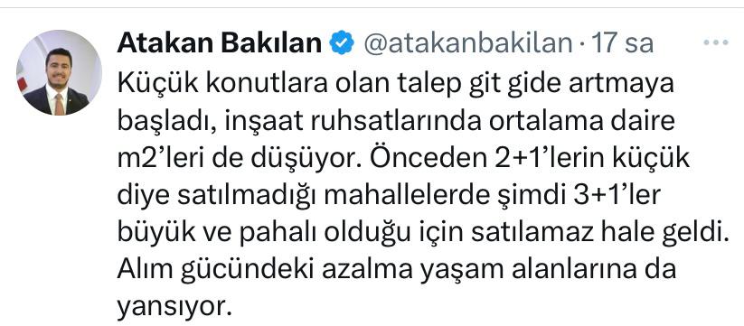 Bakılan sosyal medya hesabından inşaat ruhsatlarında ortalama metrekarelerin düştüğünü 3+1'lerin pahalı olmasından dolayı vatandaşların 2+1 konutları satın aldığını açıkladı.