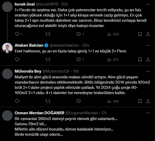 İnşaat mühendisi Atakan Bakılan, küçük konutlara talebin gittikçe arttığını söyledi. Konut fiyatlarının pahalı olmasından dolayı vatandaşların artık 3+1 yerine 2+1 konutları tercih etmeye başladığını aktardı.