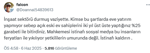 İnşaat sektörü durmuş vaziyette. Kimse bu şartlarda eve yatırım yapmıyor sebep açık eski ev sahiplerini iki yıl üst üste yaptığınız %25 garabeti ile bitirdiniz. Mahkemesi istinafı sosyal medya bu insanların feryatları ile yıkılıyor yetkililerin umurunda değil. İstinafı kaldırın .