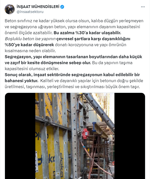 Mühendisler, Kaliteli ve dayanıklı yapılar için betonun doğru şekilde üretilmesinde ''segregasyonun kabul edilebilir bir bahanesi yoktur'' dedi. İşte inşaat Mühendislerinin sosyal medya hesabı X'ten yaptığı o payşlaşım...