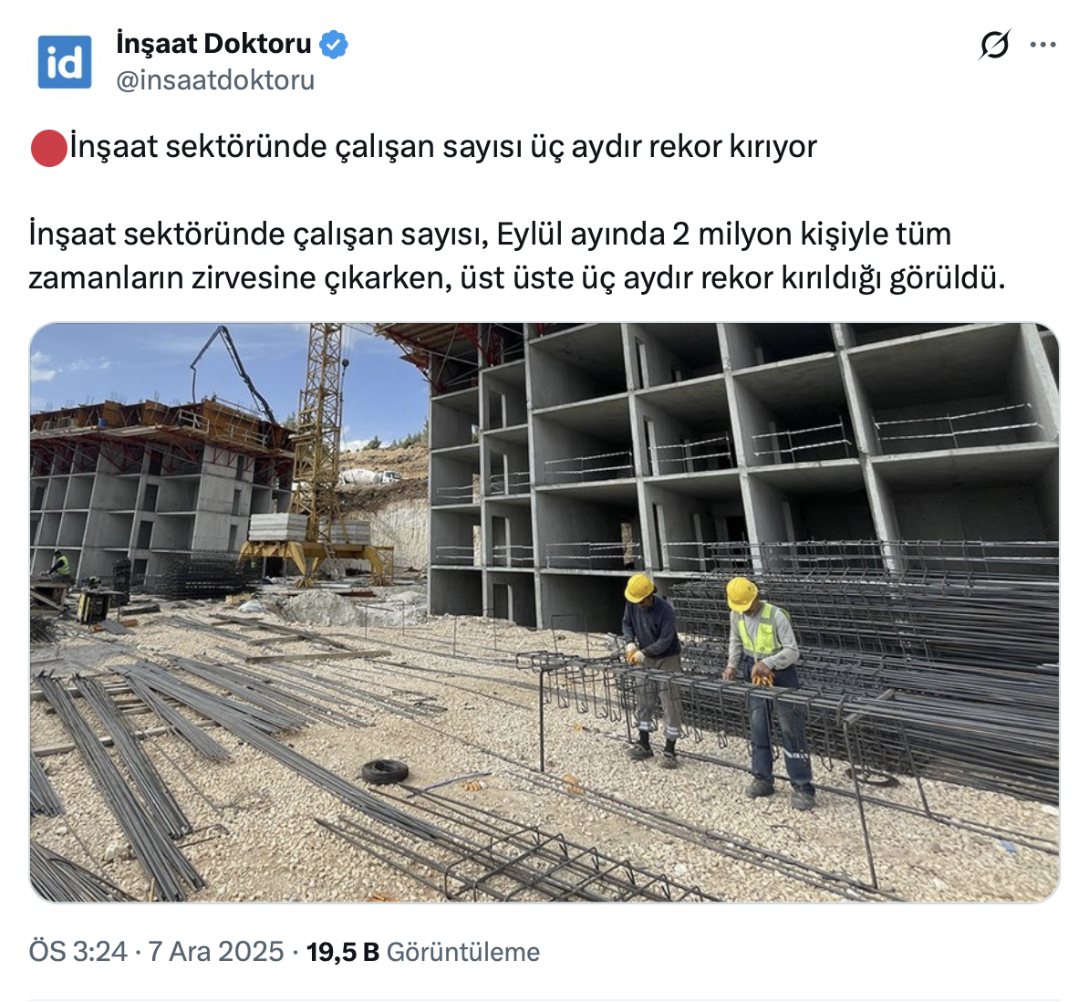 71,8 bin takipçili İnşaat Doktoru resmi sosyal medya hesabı üzerinden yaptığı paylaşımda inşaat sektöründe çalışan sayısının üç aydır rekor kırdığını belirtti.