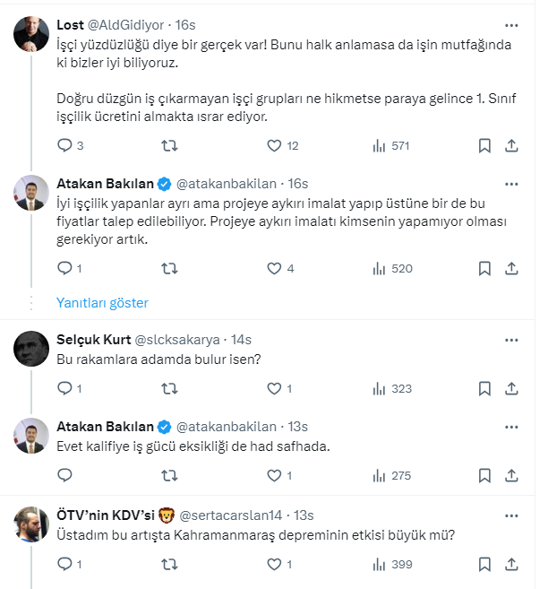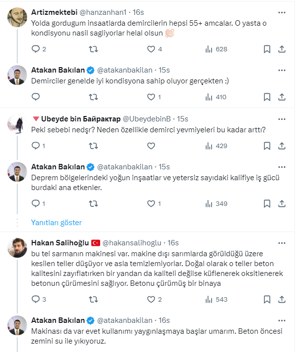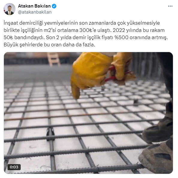 2 sene önce bu rakamın 50 lira seviyelerinde olduğu belirten Bakılan, sosyal medya hesabı X'ten, son 2 yılda demir işçilik fiyatının yüzde 500 oranında arttığını açıkladı.
