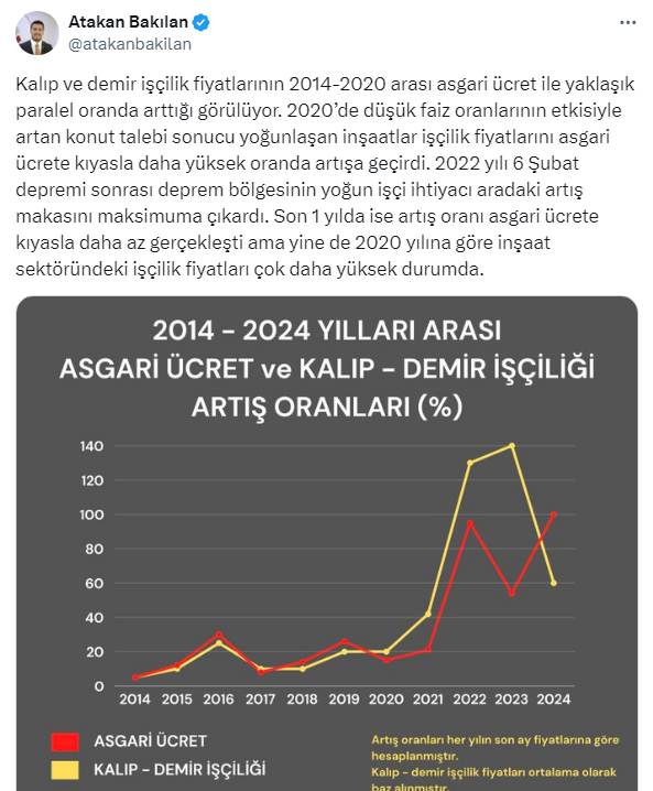 İnşaat Mühendisi ve Eskişehir Ticaret Odası Meclis Üyesi Atakan Bakılan, sosyal medya hesabından işçilik fiyatlarının asgari ücret üzerinde arttığını açıklayarak, '' 2020’de düşük faiz oranlarının etkisiyle artan konut talebi sonucu yoğunlaşan inşaatlar işçilik fiyatlarını asgari ücrete kıyasla daha yüksek oranda artışa geçirdi.'' dedi.