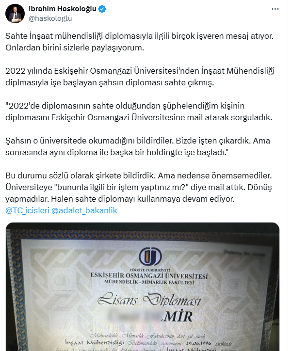 "2022'de diplomasının sahte olduğundan şüphelendiğim kişinin diplomasını Eskişehir Osmangazi Üniversitesine mail atarak sorguladık.