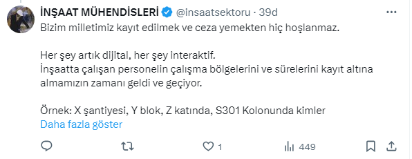İnşaat Mühendisleri, sosyal medya hesabından inşaat sektöründe inşaatta çalışan personelin çalışma bölgelerini ve sürelerini kayıt altına alınmasının zamanı geldiğini açıkladı.