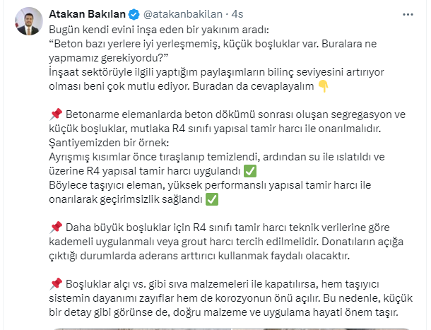 İnşaat sektörüne karşı vatandaşların artık daha bilinçli olduğunu belirten İnşaat Mühendisi Atakan Bakılan, sosyal medya hesabından örnek vererek vatandaşların inşaata karşı yaklaşımlarını açıkladı.