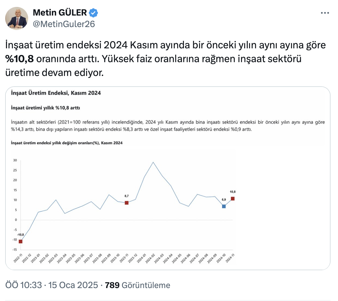Metin Güler resmi X hesabı https://x.com/MetinGuler26 üzerinden yaptığı paylaşımda inşaat üretim endeksi 2024 Kasım ayında bir önceki yılın aynı ayına göre %10,8 oranında arttığını belirterek, yüksek faiz oranlarına rağmen inşaat sektörünün üretime devam ettiğini kaydetti.
