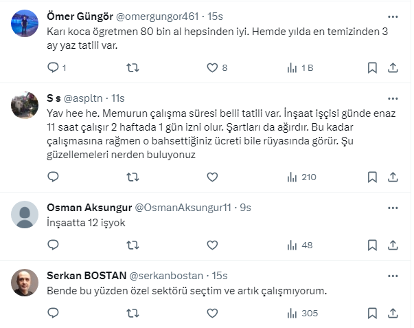 Torbalı Ticaret Odası Başkanı’nın açıklaması üzerine, x sosyal medyada 564 bin takipçili Borsa İzinde https://twitter.com/BORSAIZINDE hesabından yaptığı paylaşımda memur maaşı ile inşaat ustalarının aylıklarını karşılaştırarak sordu.