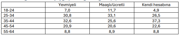 En çarpıcı sonuç 18-24 yaş grubunun payının 55-64 yaş grubundan daha düşük olması olarak ön çıktı. Yevmiyelide yüzde 7’ye yüzde 8,8; kendi hesabında yüzde 4,9’a yüzde 8,8 şeklinde belirlendi.
