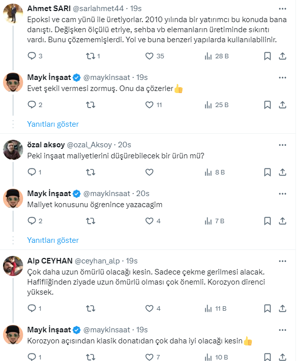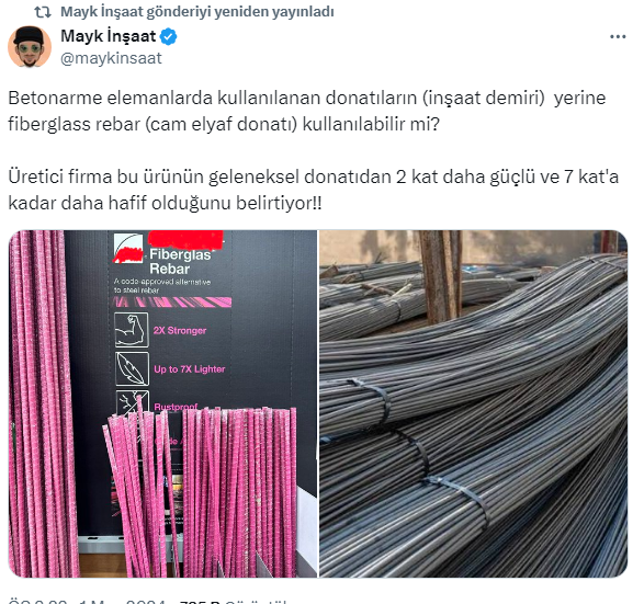 İnşaat sektörünün önemli malzemeleri arasında yer alan demirin fiyatları her geçen gün yükseliyor. Malzeme fiyatlarındaki artışlar, konut fiyatlarına yansımaya devam ediyor. İnşaat maliyetini azaltmak ve daha sagğlam olması açısından demirin yerine fiberglass rebar yani cam elyaf donatının kullanbileceği belirtildi. Üstelik demirden iki kat daha güçlü olduğu söyleniyor. Akademisyen İnşaat Mühendisi Mayk İnşaat, X sosyal medya hesabı https://twitter.com/maykinsaat üzerinden yaptığı paylaşımda vatandaşlara '' İnşatta demir yerine fiberglass rebar kullanılabilir mi?'' sorusunu sordu. İşte o paylaşım ve gelen yorumlar...