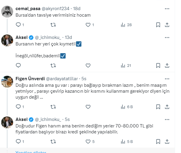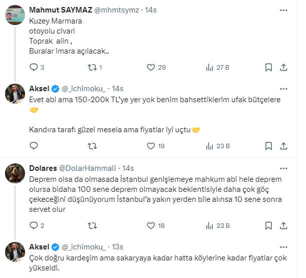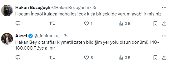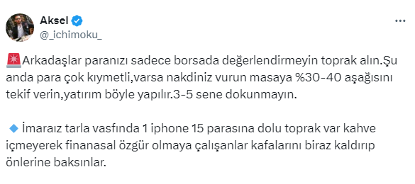 X sosyal medyada Aksel kullanıcı adıyla yatırım tavsiyelerini paylaşan girişimci, iPhone 15 parasına Türkiye’nin birçok yerinden arazi alınabileceğini belirtti. Aksel, pttps://twitter.com/_ichimoku_ X sosyal medya hesabından yaptığı paylaşımda, yatırımcılara nereden arazi almaları gerektiğini de açıkladı. İl, ilçe ve köyleri isim isim sayarak, dikkat edilmesi gerekenleri açıkladı.