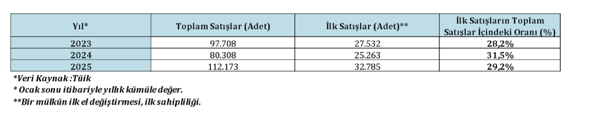 2025 Ocak ayında ilk kez satılan konut sayısı, geçen yılın aynı dönemine göre %29,77 artışla 32 bin 785 olarak kaydedildi. Toplam konut satışları içinde ilk satışların payı ise %29,23 olarak gerçekleşti.