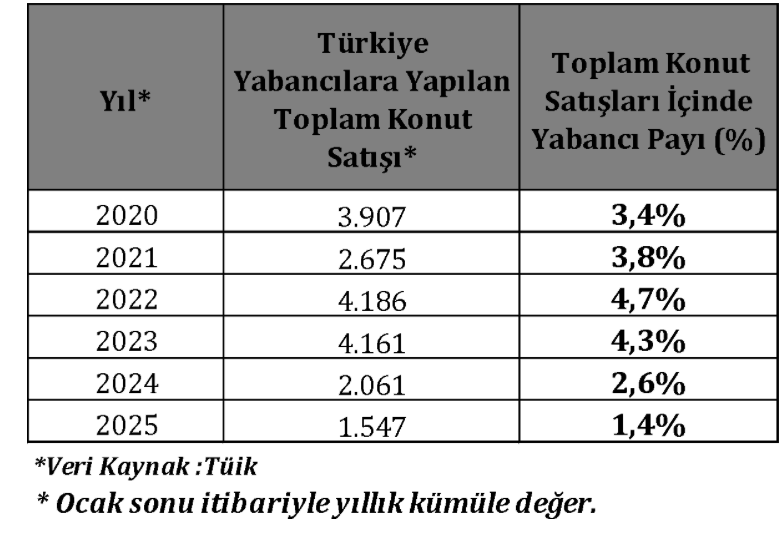 2025 Ocak ayında yabancılara yapılan konut satışları, bir önceki yılın aynı dönemine göre %24,94 azalarak 1.547 adede geriledi. Yabancılara satılan konutların toplam satışlar içindeki payı %1,38 olarak gerçekleşti. İstanbul, 611 konut satışı ile yabancılara en fazla satış yapılan şehir olurken, Antalya 469 adetle ikinci, Mersin ise 118 adetle üçüncü sırada yer aldı.