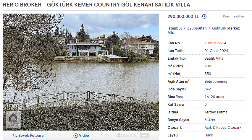 İş insanı Sadettin Saran, lüks dev villası için 290 milyon lira istiyor. Göktürk Kemer Country sitesinde toplam 1500 metrekarelik arazi üzerinde yer alan göl manzaralı, açık havuzlu ve özel mimarili tam müstakil satılık villada, dev bahçe, açık ve kapalı otopark, kamelya bulunuyor.
