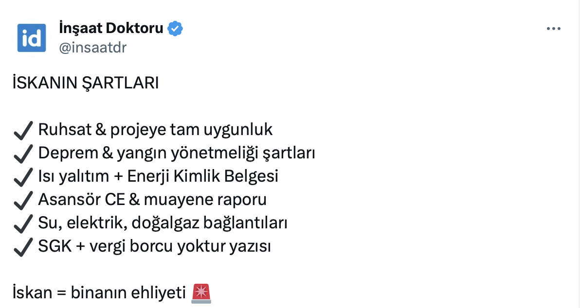 Emlak, inşaat ve konut sektörü ile ilgili yaptığı paylaşımlarla dikkat çeken 57,6 bin takipçili İnşaat Doktoru resmi X hesabı https://twitter.com/insaatdr üzerinden iskanın şartlarını açıkladı.