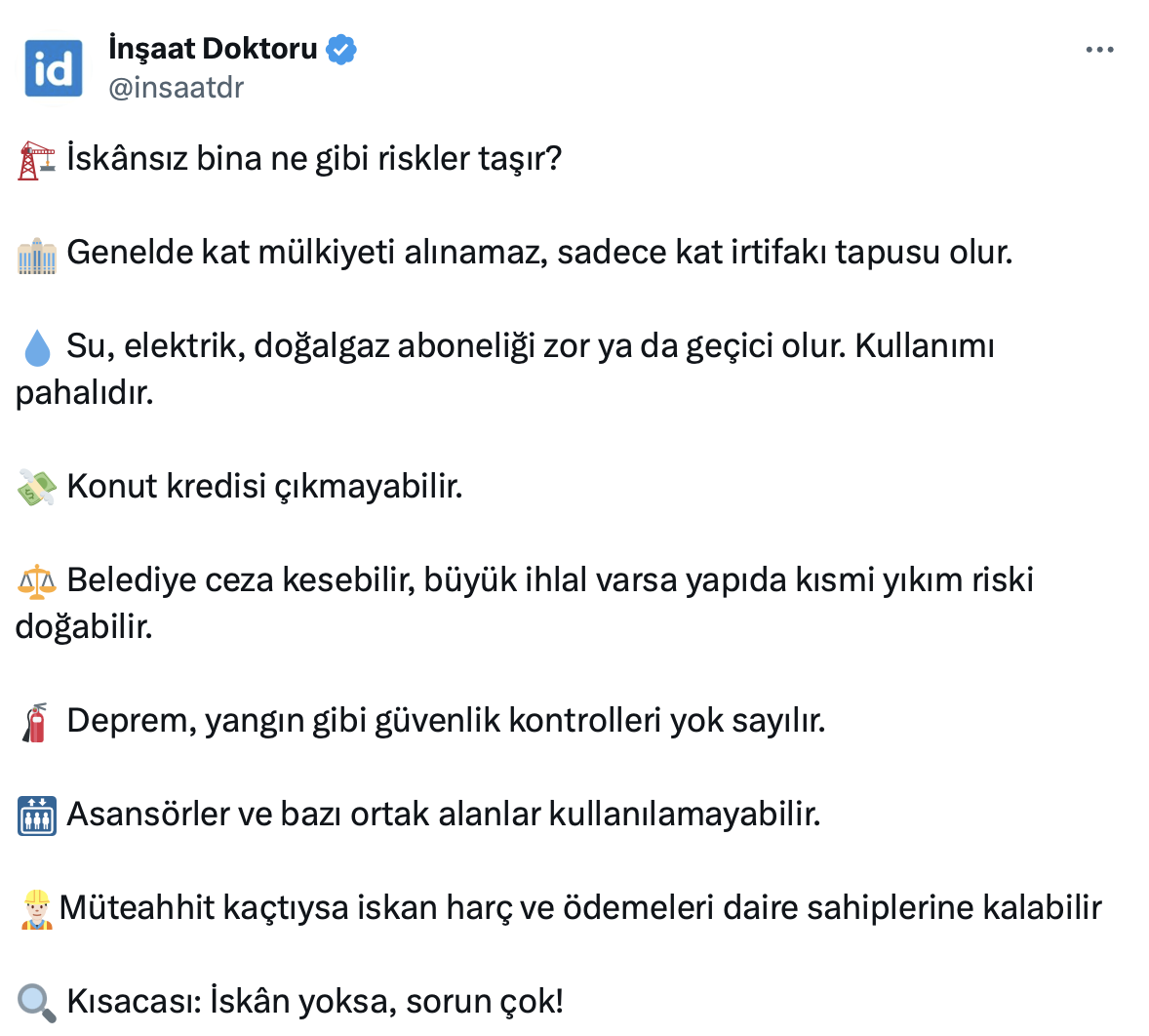 İnşaat Doktoru yaptığı paylaşımda iskansız binanın ne gibi riskler taşıdığını açıkladı.