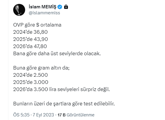 Altın ve Para Piyasaları Uzmanı İslam Memiş, Orta Vadeli Program (OVP) sonrası tahminlerini sosyal medya üzerinden takipçileriyle paylaştı. İslam Memiş, şöyle yazdı: