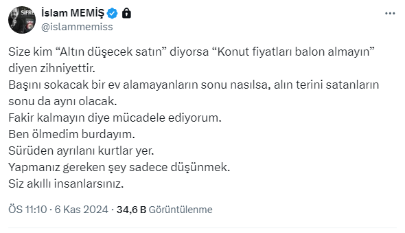 İslam Memiş her zaman yatırımcılara, ellerindekilere sahip çıkmaları konusunda uyardı. 'Altınlarınızı bozun' diyenlere inanmayın diyen Memiş, aynısını konut için de söyledi. Memiş ''Size kim “Altın düşecek satın” diyorsa “Konut fiyatları balon almayın” diyen zihniyettir.' diyerek yatırımcıları uyardı. İşte İslam Memiş'in sosyal medya hesabı X'ten yaptığı o paylaşım...