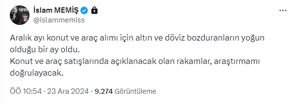 Altın yorumları ile tanınan ünlü ekonomist İslam Memiş, aralık ayında yatırımcıların altın ve döviz bozdurarak konut ve araba aldığını söyledi.
