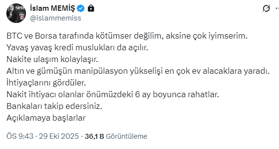 Sosyal medya hesabından, borsa, altın ve gümüş piyasası ile ilgili değerlendirmelerde bulunan Memiş borsa tarafında kötümser olmadığını belirterek, kredi musluklarının açılmasıyla nakite ulaşımın kolaylacağını açıkladı.
