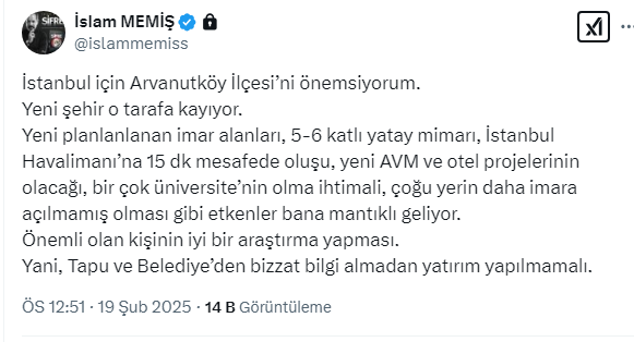 Altın yorumları ile tanınan ünlü ekonomist İslam Memiş, İstanbul'dan arsa ve arsa yatırımcıları için kritik açıklamalarda bulundu. Memiş, İstanbul'dan arsa ve ev almak isteyenlere Arnavutköy ilçesini önerdi.