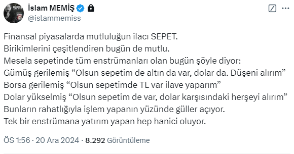 Memiş, kısaca şöyle açıkladı; altın, gümüş, dolar ve borsada sepet yaparak yatırım yapanların her zaman mutlu olduğunu söyledi.