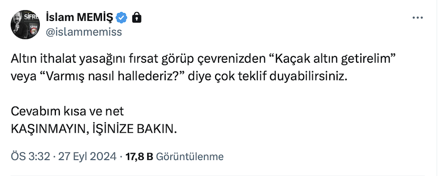 Finans Analisti İslam Memiş, yaptığı paylaşımda, "Altın ithalat yasağını fırsat görüp çevrenizden "Kaçak altın getirelim" veya Varmış nasıl hallederiz?" diye çok teklif duyabilirsiniz. Cevabım kısa ve net. Kaşınmayın, işinize bakın" dedi.