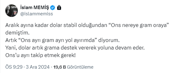 İşte İslam Memiş'in sosyal medya hesabı X'ten yaptığı o paylaşım ''Aralık ayına kadar dolar stabil olduğundan “Ons nereye gram oraya” demiştim. Artık “Ons ayrı gram ayrı yol ayırımda” diyorum. Yani, dolar artık grama destek vererek yoluna devam eder. Ons’u ayrı takip etmek gerek!'' dedi.