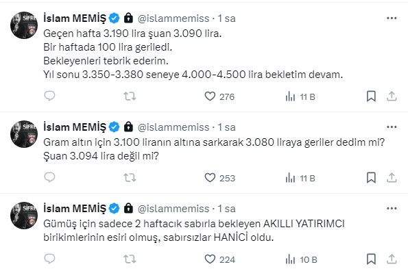 İslam Memiş, ABD seçimlerinin ardından altın fiyatlarındaki düşüşle ilgili ''Geçen hafta 3.190 lira şuan 3.090 lira. Bir haftada 100 lira geriledi. Bekleyenleri tebrik ederim. Yıl sonu 3.350-3.380 seneye 4.000-4.500 lira bekletim devam.'' diyerek yatırımcılara seslendi.